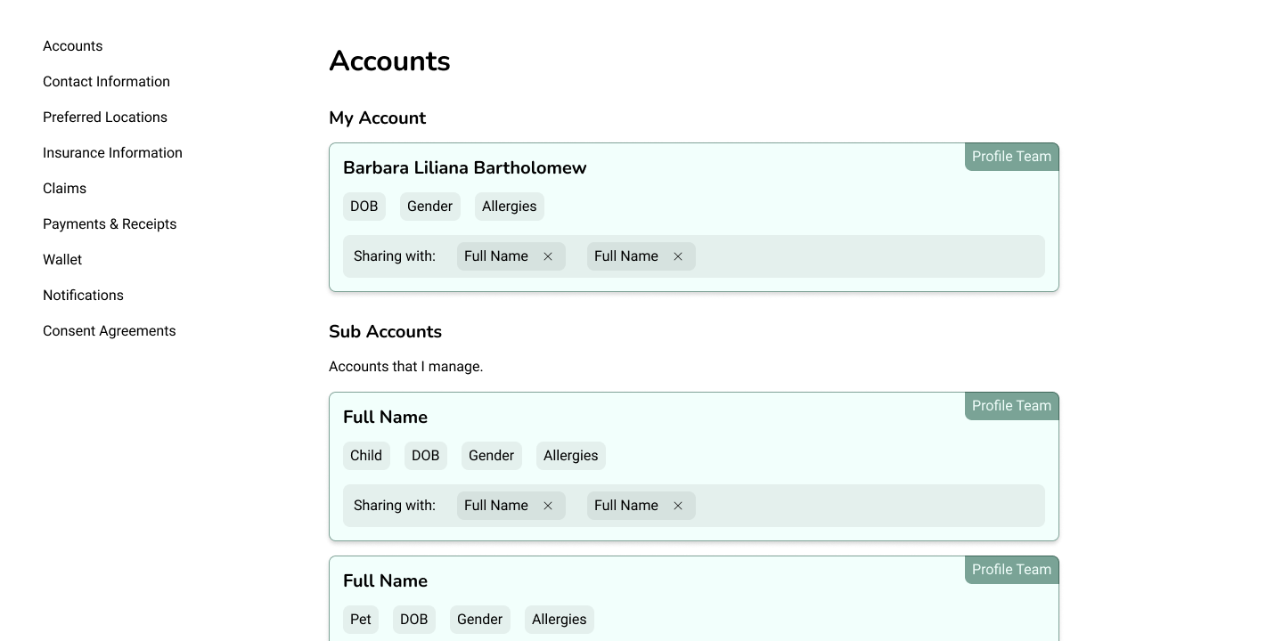 With many teams working to create a complete patient/customer profile and a consolidated health and wellness account management experience, it was crucial to visualize what data points were needed and to highlight which teams were responsible for them.